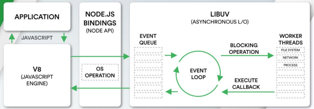 - 我们编写的JavaScript 代码会经过V8 引擎,再通过Node.js 的Bindings ,将任务放到Libuv 的事件循环中;