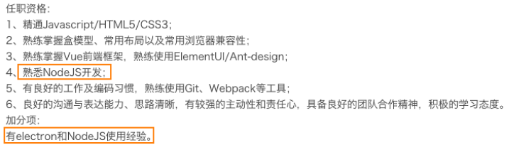 - Node.js的快速发展也让企业对Node.js技术越来越重视,在前端招聘中通常会对Node.js有一定的要求,特别对于高级前端开发工程师, Node.js更是必不可少的技能:
